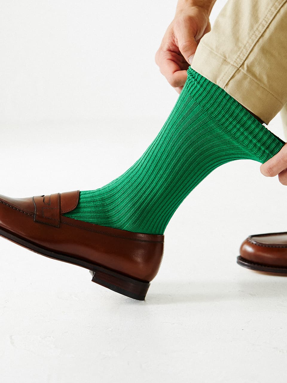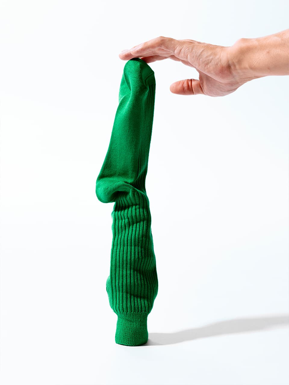 見た目のクラシカルさとは裏腹に、その中身は極めてハイスペック。原料染めから編み立て、加工まで、すべての工程を大阪で行う“純国産”仕様だ。生地は自立するほどにシャンと立ち上がり、密度の高い編みが形を保つ。それでいて、履き込むほどに糸がほぐれ、やわらかく足になじんでいく。素材には、コットンとアクリルを絶妙なバランスでブレンドした別注糸を採用。ふくらみのある弾力としなやかさが同居し、厚手ながらも驚くほどなめらかな肌触りを生む。季節を問わず快適に履ける理由は、この糸の設計にある。さらに、つま先とかかとには補強構造を内蔵。テンションがかかっても穴が開きにくく、繰り返しの洗濯にも耐える。タフでありながら、履くたびに柔らかさを増していく――“強さとやさしさ”、その両方を備えた確かなつくりが、この一足の本質を語っている。